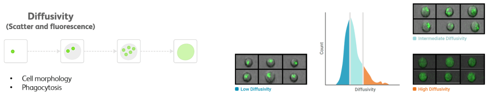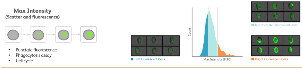 To help illustrate what some of the more interesting derived parameters mean, and how they can be thought of to help identify cells of interest, Figure 1 shows a cartoon of the feature and what images look like from low / medium / high intensity values.