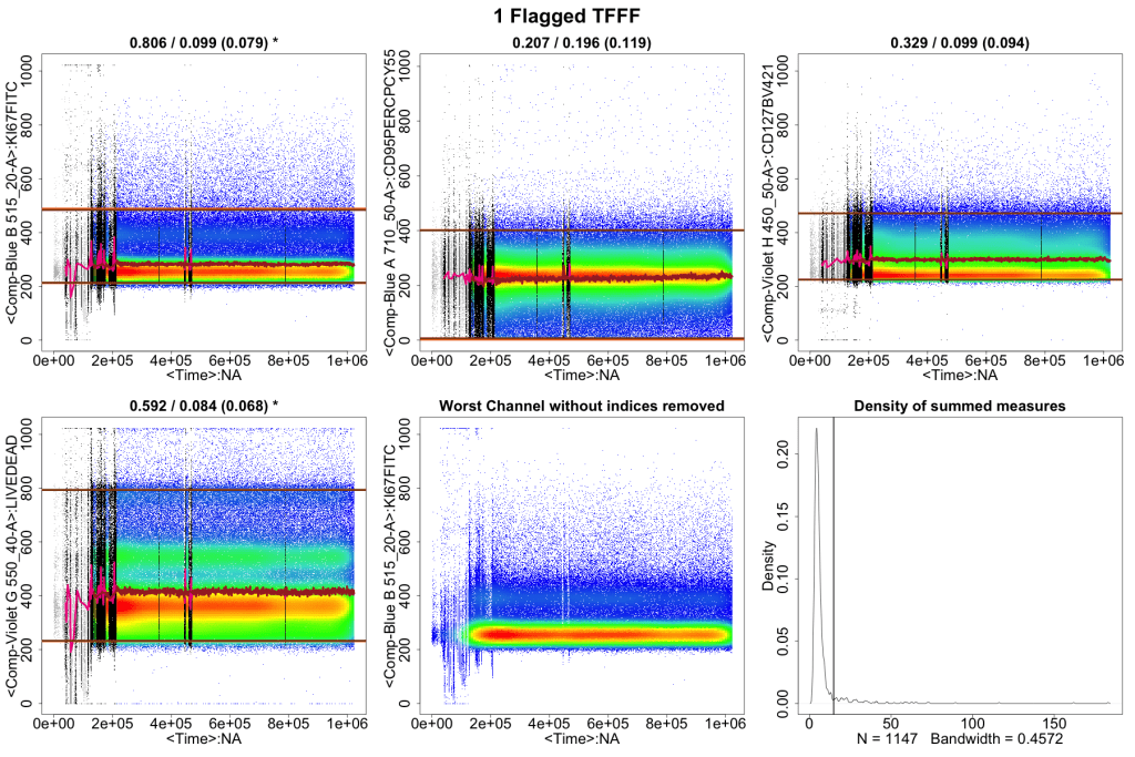 At the top of most plots are a series of numbers. The first number indicates the mean drift before cleaning, the second number represents the mean drift after cutting and the third number in parenthesis represents the max one step change after cutting. The second to last plot displays the worst channel over time. The last plot is a density of summed measures plot showing a sum of the 8 metrics that flowCut evaluates. Segments that deviate more will have a higher sum of their metrics and will be located on the right side of the density plot. The line indicates the cutoff point set by the algorithm, any data segment to the right of that point is labeled as “BadEvents”.