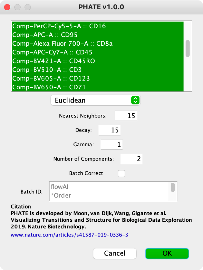 6. This will launch a plugin dialog, all Comp- prefixed parameters will be selected initially, and default settings applied. Choose any subset of parameters that you want to be considered for dimensionality