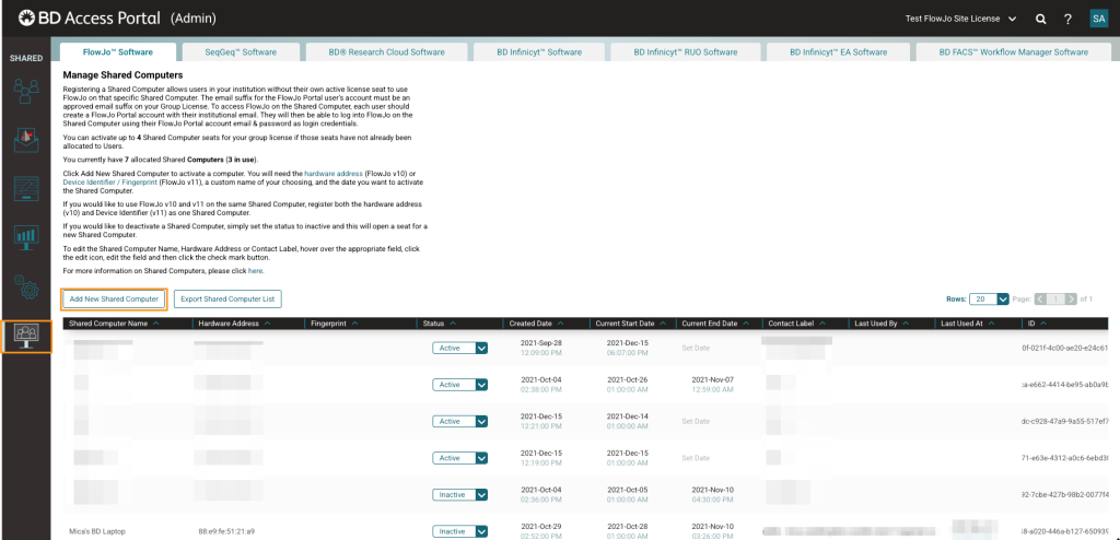 - Add the detected Hardware Address from FlowJo v10 and/or add the Device Identifier/Fingerprint from the BD Access Portal application to register the shared computer for access to FlowJo v10 and/or v11, respectively. (required)