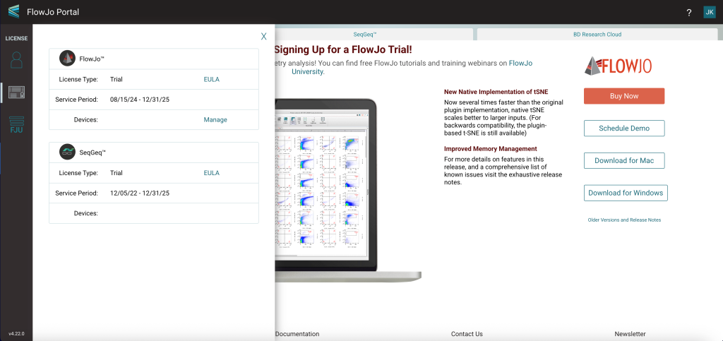 Researchers accessing FlowJo Portal-enabled platforms such as FlowJo or SeqGeq have the ability to authorize the software on up to 4 computers of their choosing, one computer at a time.